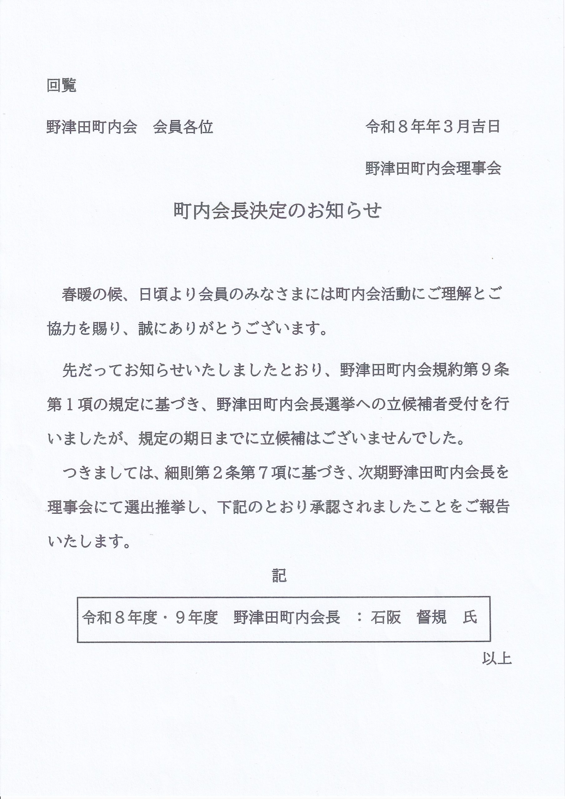 町内会長決定のお知らせ