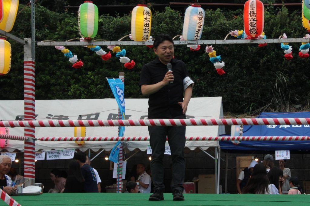 会長が、「では、今年の盆踊りもこの曲で最後です。皆様も一緒に踊りましょう。」