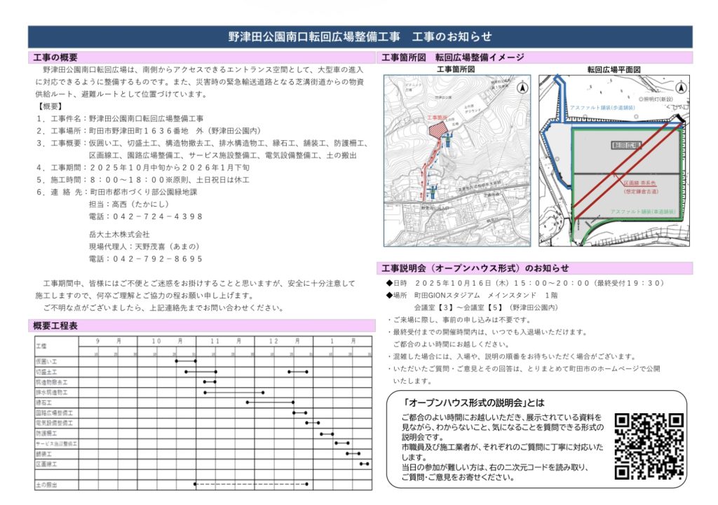 町田市より野津田公園南口展回広場の工事概要と説明会開催のお知らせになります。